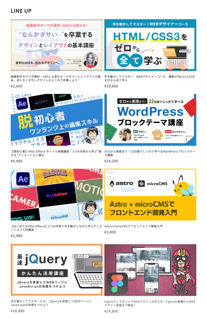 Webデザイン、プログラミング、マーケティング、AI活用など、幅広い分野の実務スキルを習得できます。動画教材とハンズオン形式を組み合わせ、実践的な学習を実現します。