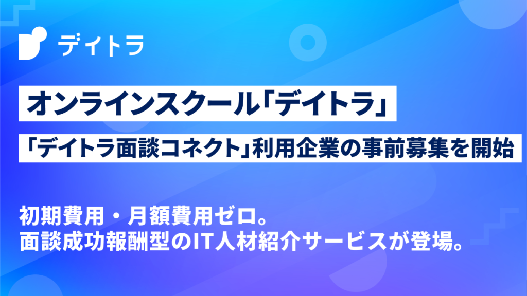 オンラインスクール運営の株式会社デイトラは、初期費用・月額固定費が一切かからない面談成果報酬型のIT人材紹介サービス「デイトラ面談コネクト」の利用企業(人材紹介会社)の事前募集を開始します。
