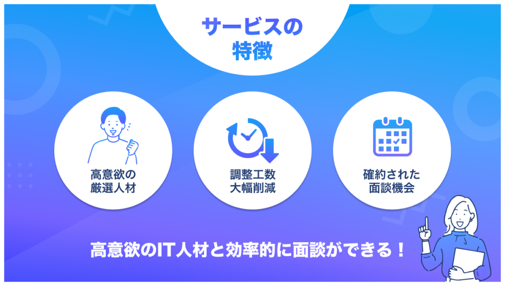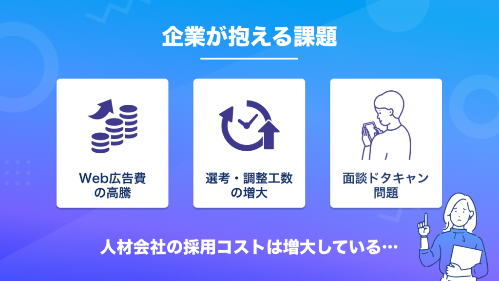 本サービスは、IT人材採用における「広告費の高騰」「選考・調整工数の増大」「面談のドタキャン」といった企業の課題を解決するために開発されました。