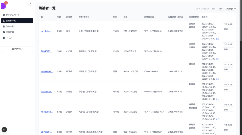 専用のCRM(顧客関係管理)プラットフォームにより、候補者情報の一元管理や面談オファーも効率的に行えるため、採用担当者の負担が劇的に軽減されます。
